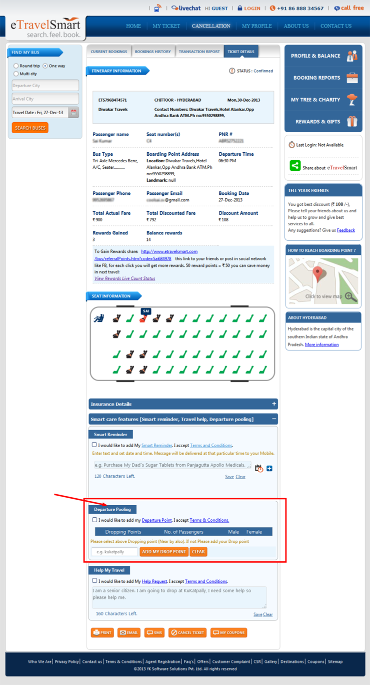 New FeaturesMost of the customers face problems in reaching their desired destinations from a particular dropping point for the given bus. In such cases, after successful booking customers can mention their desired destination point along with the rest of the passengers in the same bus. Passengers who have common destination points can pool up for better security reasons and for sharing costs. The beauty of this option is that, the application keeps the customer's personal information/mobile numbers extremely confidential without any access to other passengers while pooling up for common destinations. The application in a secure mode reaches out to other passengers and enables only willing customers to directly get in touch with common destination passengers.