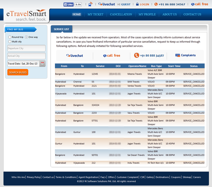 New FeaturesIn a volatile Bus Industry environment, we are mere facilitators for external operators/parties who happens to be the real service providers/fleet runners. Because of unforeseen/unavailable reasons, these external operators/parties cancel their specific bus services at the last minute and we also happen to get the information in the last minute or even to the extent of hearing sometimes from the customers. To avoid confusion for customers, we specifically publish the list of cancelled services in our website where no other competitor does (list consists of only services which we have confirmation from external operators/parties). This real time data helps customers to a large extent in planning their alternatives well in advance.