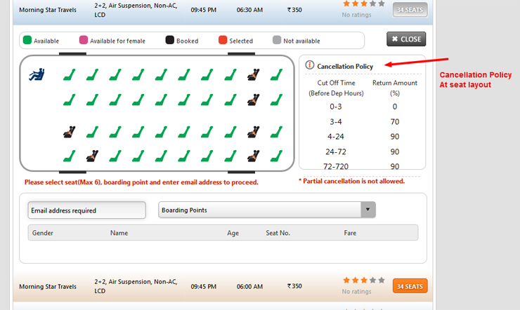 No need to dig our site to know cancellation policy for particular bus, simply passengers are able to check out cancellation policy at the time of bus ticket booking in seat layout.