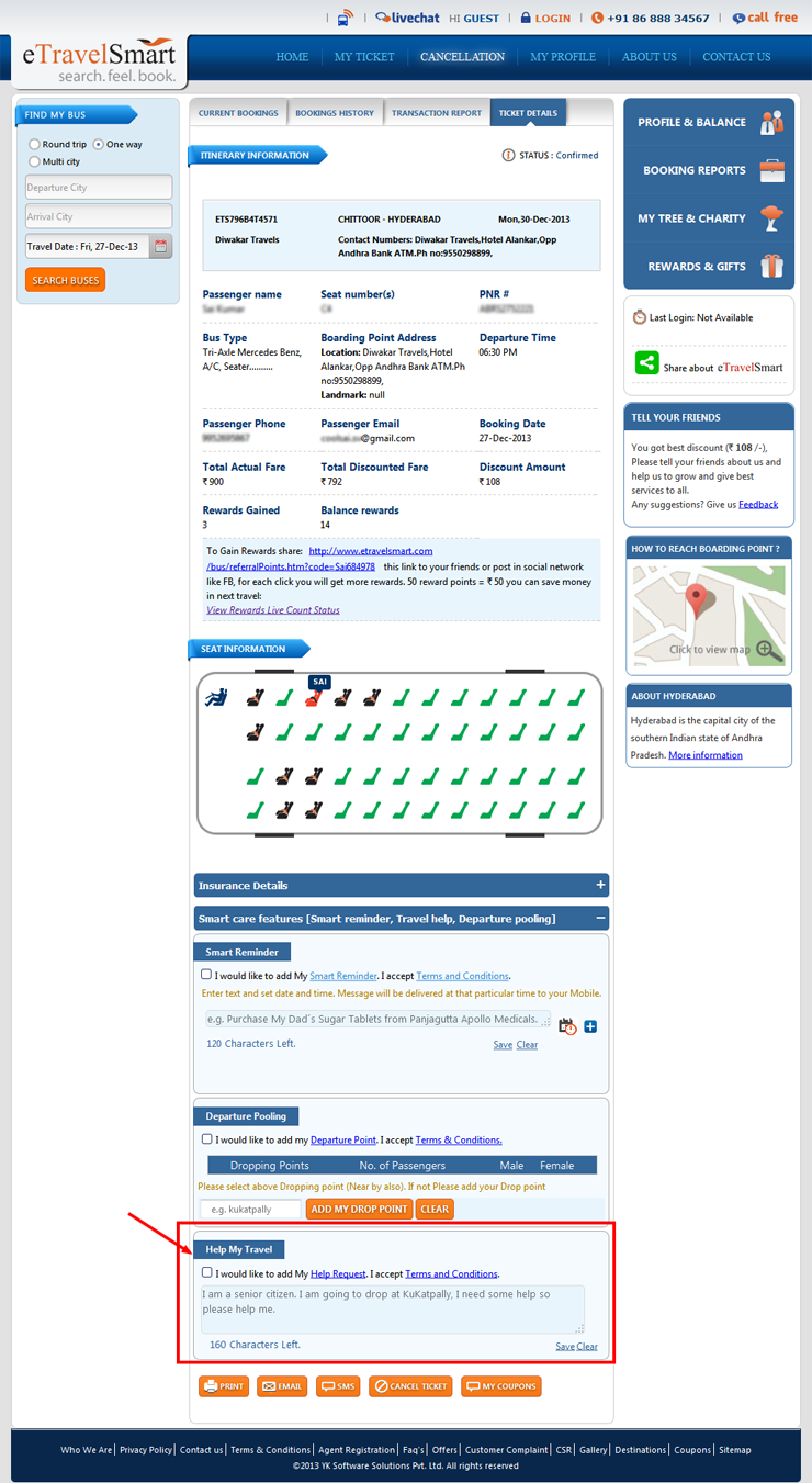 Access Travel Help in ticket confirmation page while booking bus tickets with eTravelSmart.