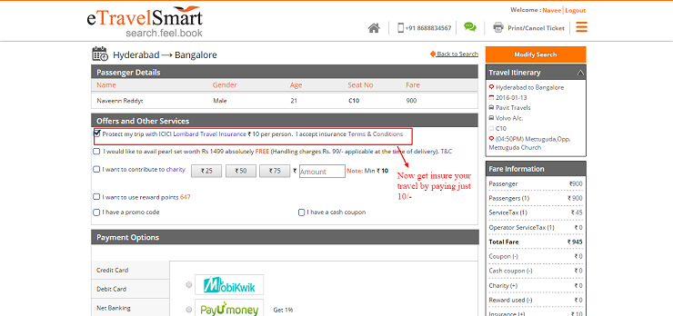 2. Avail 3Lakh worth of "Travel Insurance" from ICICI Lombard, while booking bus tickets in confirmation page by clicking button "Protect My Trip".